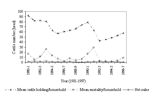 2. how cattle holdings had changed over the period 1980-97 and estimate economic losses attributable to cattle mortality. Results would give insights into system changes, trends on small ruminant and camel production, and long-term dynamics for the cattle population and would provide information for designing natural resource and risk management interventions.